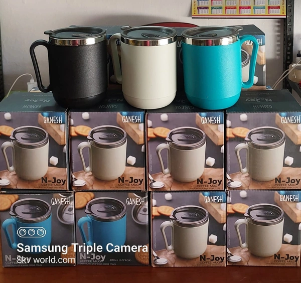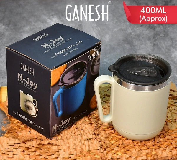 8137 GANESH PREMIUM STAINLESS STEEL COFFEE MUG WITH HEAT RESISTANT MUG LID. APPROX 400ML MUG.
